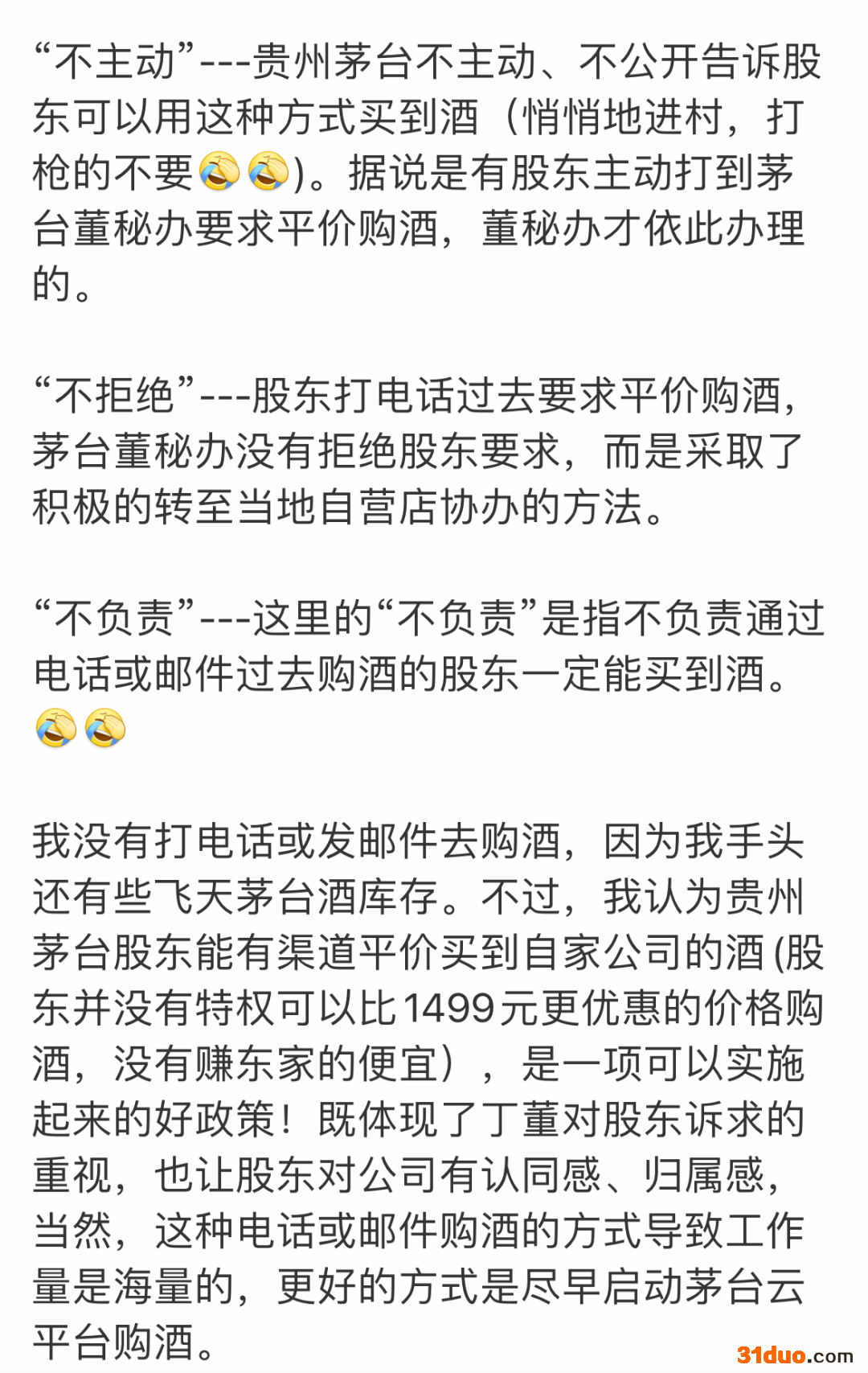 “不主动”---贵州茅台不主动、不公开告诉股东可以用这种方式买到酒(悄悄地进村,打枪的不要)。据说是有股东主动打到茅台董秘办要求平价购酒,董秘办才依此办理的。