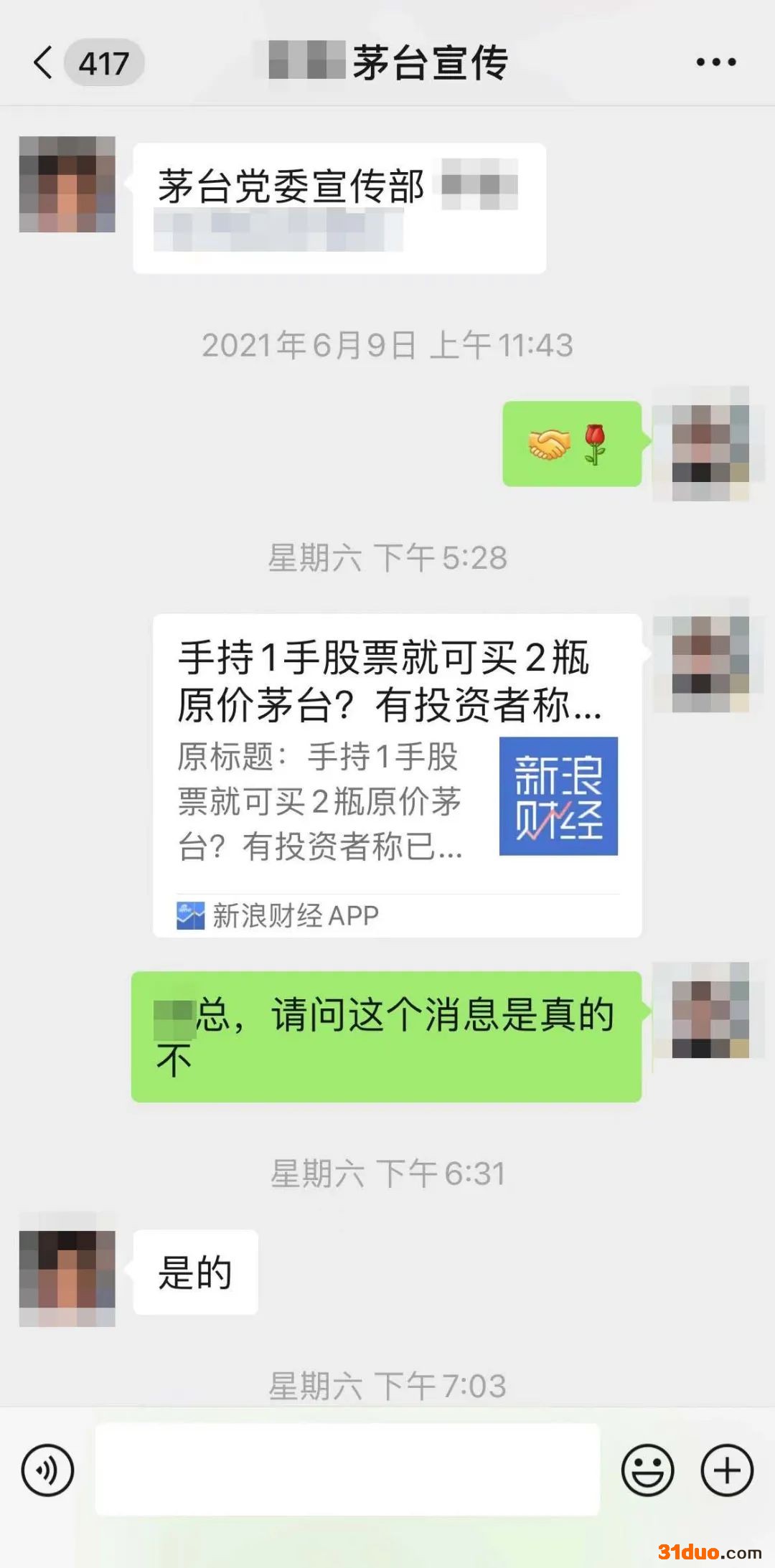 此消息被茅台时空公号转载,但至今都未看到贵州茅台公司就此事进行公开说明。而有小股东在微博上戏称,贵州茅台这种行为神似“三不”男人的“不主动、不拒绝、不负责”。