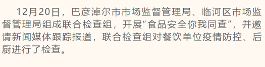 中国经济网北京12月21日讯 据巴彦淖尔日报社全媒体微信公众平台“掌上巴彦淖尔”报道,12月20日,巴彦淖尔市市场监督管理局、临河区市场监督管理局组成联合检查组,开展“食品安全你我同查”,并邀请新闻媒体跟踪报道,联合检查组对餐饮单位疫情防控、后厨进行了检查。检查过程中,联合检查组对后厨环境、食品原料库房、操作间等重点区域进行了详细检查。
