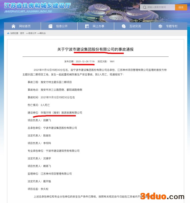 中华网财经12月21日讯:据江苏省住房和城乡建设厅官网近期发布的《关于宁波市建设集团股份有限公司的事故通报》显示,2021年11月
