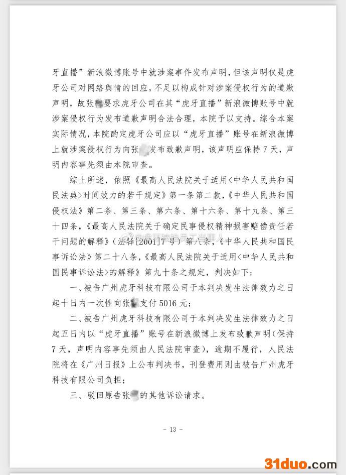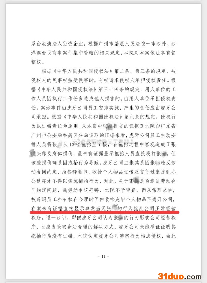一年前虎牙被抬员工胜诉,虎牙被判赔偿5016元并公开道歉