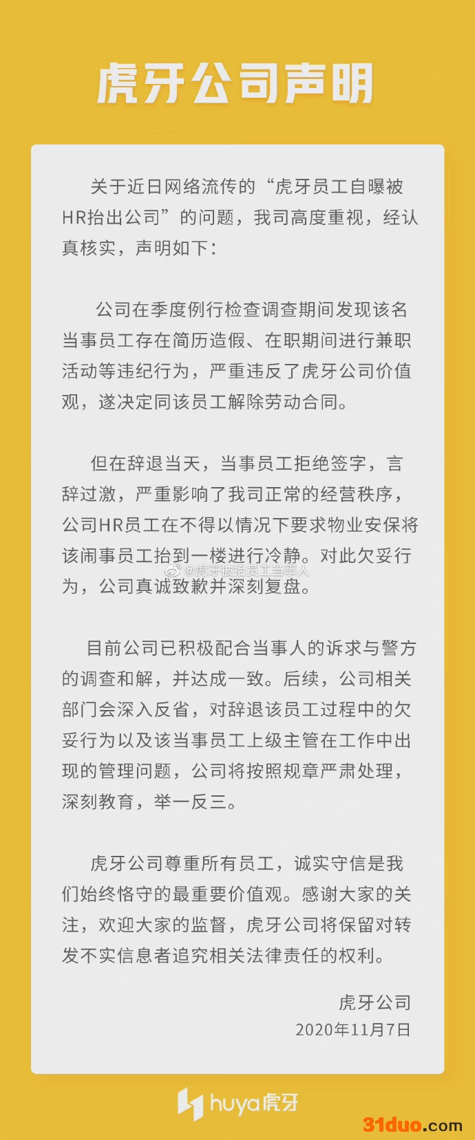 当时,虎牙方面发表声明称,该员工简历造假、在职期间兼职严重违纪,严重违反了虎牙公司价值观,遂决定同该员工解除劳动合同。