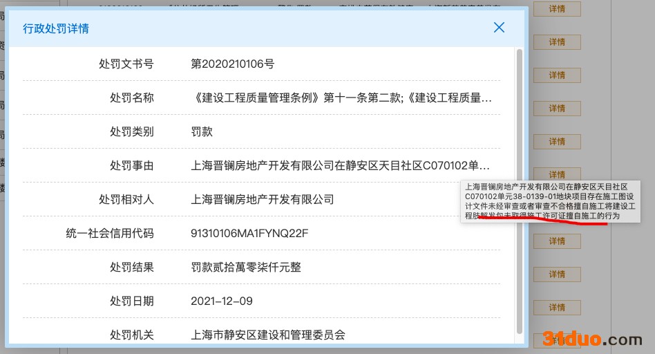 中华网财经12月21日讯:据上海市静安区人民政府网近日发布的处罚文书号“第2020210106号”显示,上海晋镧房地产开发有限公司因在静安区天目社区C070102单元38-0139-01地块项目存在施工图设计文件未经审核或审查不合格擅自施工将建设工程肢解发包未取得施工许可证擅自施工行为,被上海时静安区建设和管理委员会处罚,罚款20.7万元,处罚决定日期为2021年12月9日。