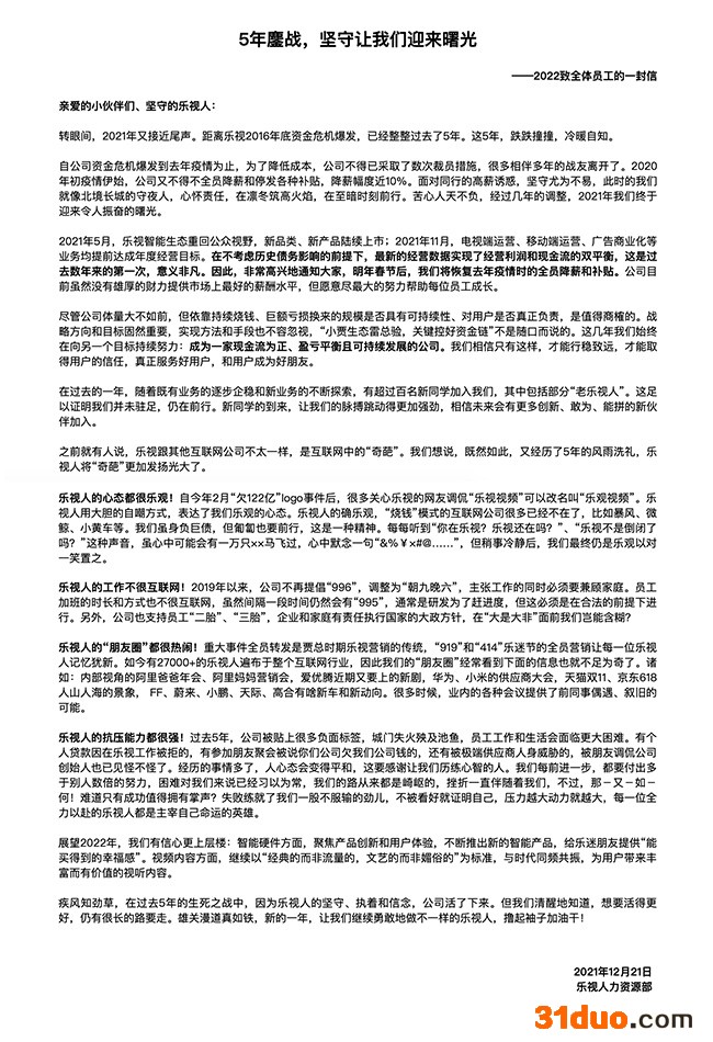 乐视表示,自公司资金危机爆发到去年疫情为止,为了降低成本,公司不得已采取了数次裁员措施,很多相伴多年的战友离开了。2020年初疼情伊始限公司又不得不全员隆薪和停发各种补贴,降薪幅度近10%。“面对同行的高薪诱惑,坚守尤为不易,此时的我们就像北境长城的守夜人,心怀责任,在凛冬筑高火焰,在至暗时刻前行。苦心人天不负,经过几年的调整,2021年我们终于迎来令人振奋的曙光。”