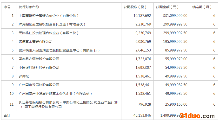 高毅邻山1号远望基金获配1018.77万股,获配金额为3.31亿元;天津礼仁投资、珠海煦远诺成股权投资合伙企业均获配923.08万股,获配金额均为3亿元;知名牛散郭伟松也获配了153.85万股。