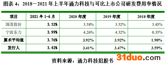 可见,除了2018年宁波东力由于从事供应链业务的重要子公司收入规模较大导致当年的研发费用率较低外,2019—2021年上半年通力科技的研发费用率均低于同行业可比上市公司国茂股份、宁波东力,在研发投入上难言优势。