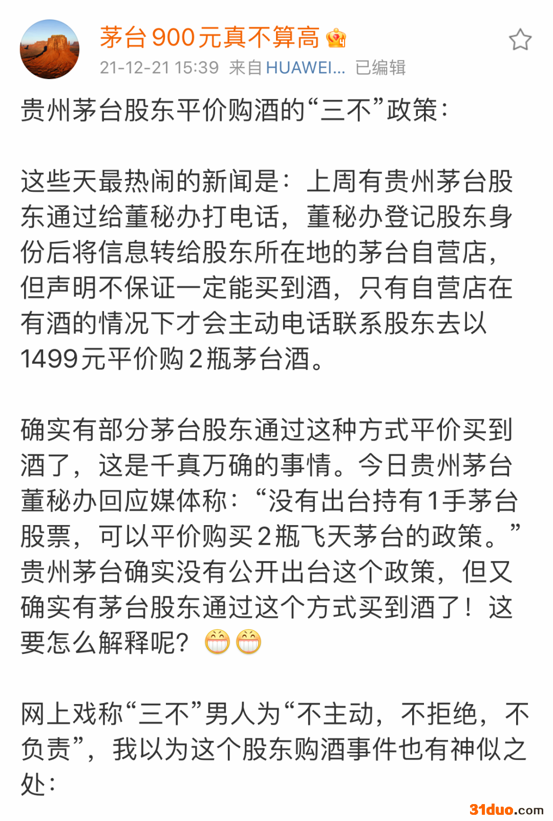 对此,知名财经博主、茅台股东“茅台900不高”对此发微博,戏称茅台的这个行为神似“三不”男人的“不主动、不拒绝、不负责”: