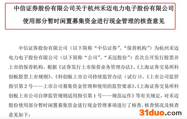 ●禾迈股份表示,现金管理计划是在确保公司募投项目所需资金和保证募集资金安全的前提下进行的,不会影响公司日常资金正常周转需要和募投项目的正常运转,不会影响公司主营业务的正常开展,亦不存在变相改变募集资金投向和损害公司及股东利益的情形。