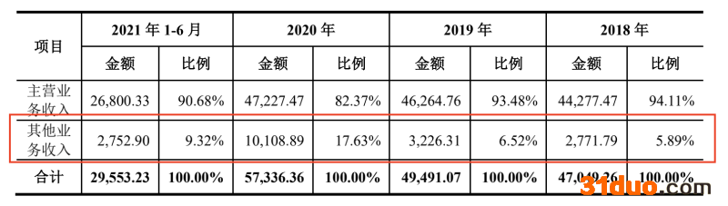 值得一提的是,2018年至2020年以及2021年上半年,恒勃股份其他业务收入占比分别为5.89%、6.52%、17.63%和9.32%,2020年公司开展口罩等医疗器械业务,实现销售收入约6502.06万元。