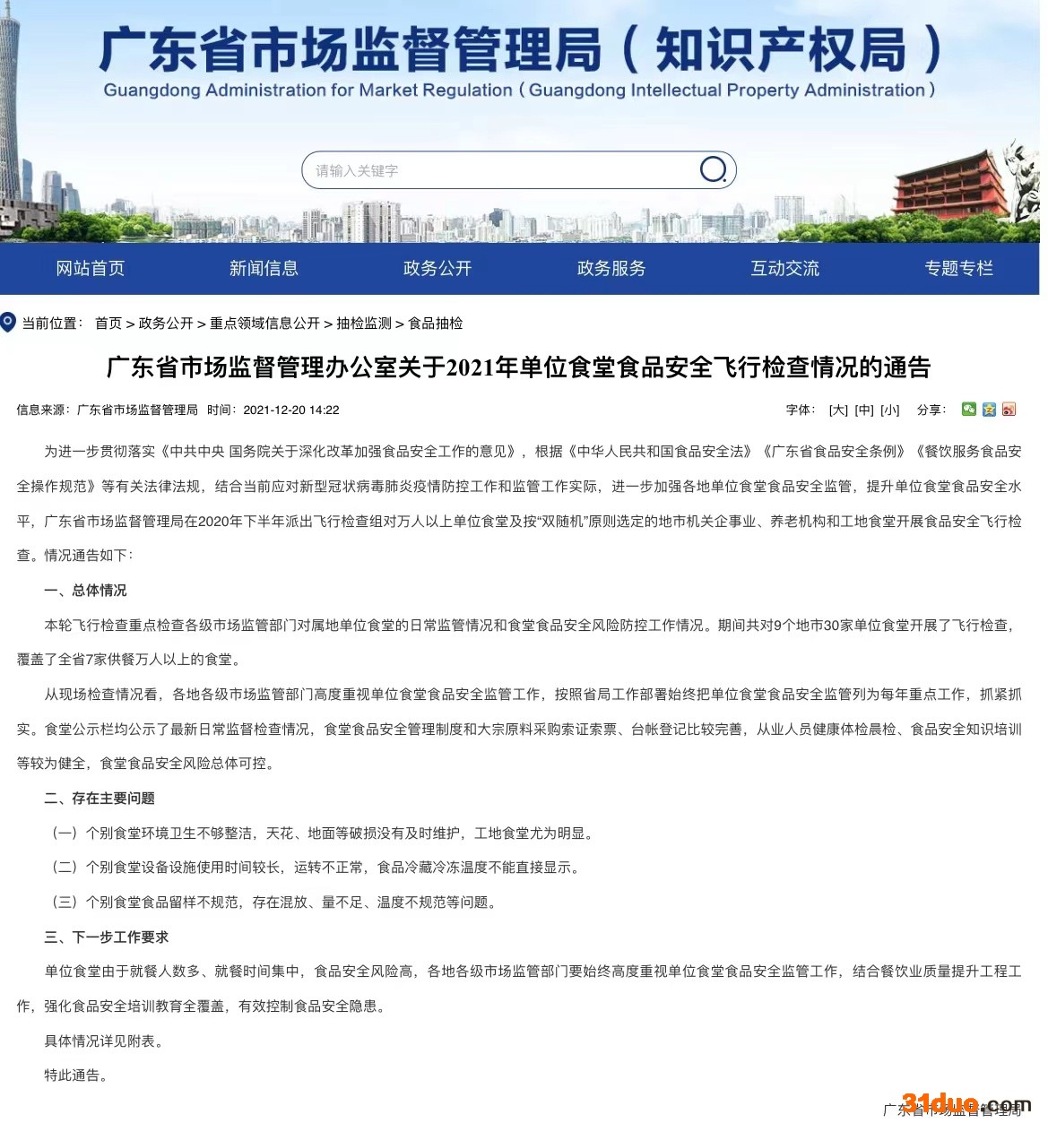 中国经济网北京12月22日讯 12月20日,广东省市场监督管理局网站公布了《广东省市场监督管理办公室关于2021年单位食堂食品安全飞行检查情况的通告》。广东省市场监督管理局在2020年下半年派出飞行检查组对万人以上单位食堂及按“双随机”原则选定的地市机关企事业、养老机构和工地食堂开展食品安全飞行检查。本轮飞行检查重点检查各级市场监管部门对属地单位食堂的日常监管情况和食堂食品安全风险防控工作情况。期间共对9个地市30家单位食堂开展了飞行检查,覆盖了全省7家供餐万人以上的食堂。