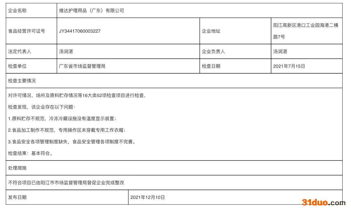其中,广东省市场监督管理局对维达护理用品(广东)有限公司许可情况、场所及原料贮存情况等16大类52项检查项目进行检查,检查发现,该企业存在以下问题:1.原料贮存不规范,冷冻冷藏设施没有温度显示装置;2.食品加工制作不规范,专用操作区未穿戴专用工作衣帽;3.食品安全各项管理制度缺失,食品安全管理各项制度不完善。检查结果为基本符合。不符合项目已由阳江市市场监督管理局督促企业完成整改。检查日期为2021年7月15日。