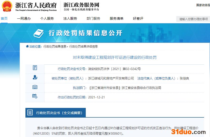 中国经济网北京12月22日讯昨日,浙江省人民政府网站公示的行政处罚决定书(湖安综执罚决字〔2021〕第02-0242号)显示,浙江绿城