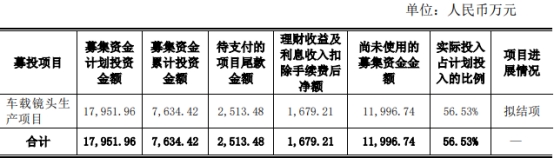 截至2021年11月30日,永新光学“车载镜头生产项目”已经建设完成并投入使用,生产能力达到项目规划,共计使用募集资金1.01亿元(含待支付的项目尾款2513.48万元)。“车载镜头生产项目”结项后,永新光学首次公开发行募集资金投资项目全部实施完成。