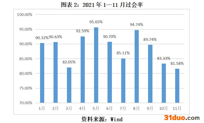 今年前11月,发审委/上市委累计审核463家企业,410家过会,审核通过率为88.55%。具体来看,今年1-11月的过会率分别为90.32%、90.63%、82.05%、92.59%、95.65%、90.7%、85.11%、94.74%、89.74%、83.33%、81.58%。从今年8月至11月,IPO过会率持续下降,11月过会率更是创年内新低。