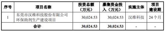 汉维科技原拟公开发行新股数量不超过3057.64万股(未考虑公司A股发行的超额配售选择权),占发行后总股本的比例不低于25%。汉维科技原拟募集资金3.00亿元,用于东莞市汉维科技股份有限公司环保助剂生产建设项目。