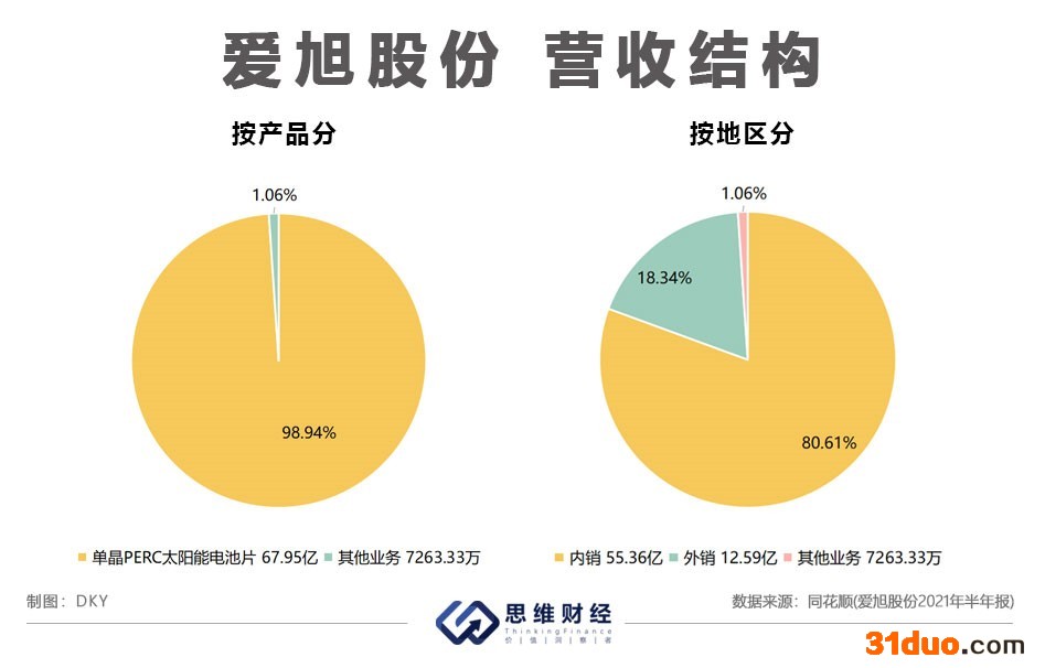 今年,受“碳达峰”“碳中和”政策影响,新能源各细分赛道备受关注,尤其是光伏行业。爱旭股份于2019年借壳ST新梅上市,主营业务为高效太阳能电池的研发、制造与销售,主要产品为单晶太阳能电池片、单晶PERC太阳能电池片、多晶太阳能电池片。其中,单晶PERC太阳能电池片是公司营收的主要贡献点,占比达98.94%。