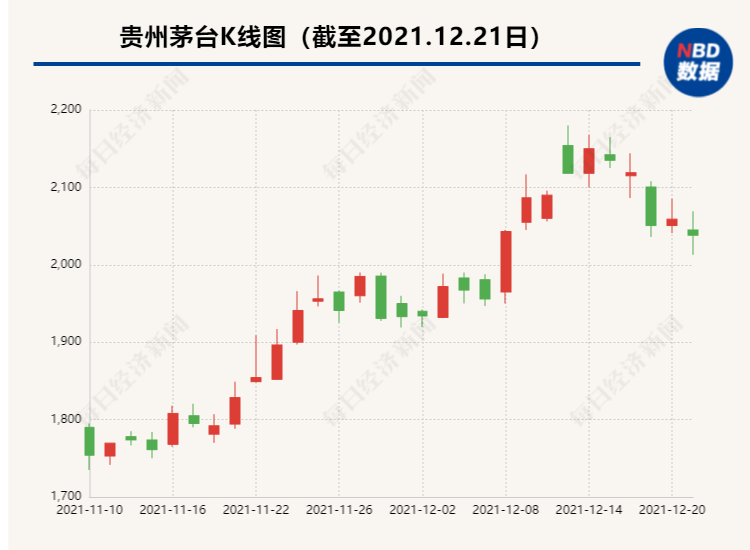 近期,贵州茅台的股价也出现回调。自上周一(12月13日)以来,贵州茅台股价从最高2180元/股,跌至12月21日收盘的2038.2元/股。
