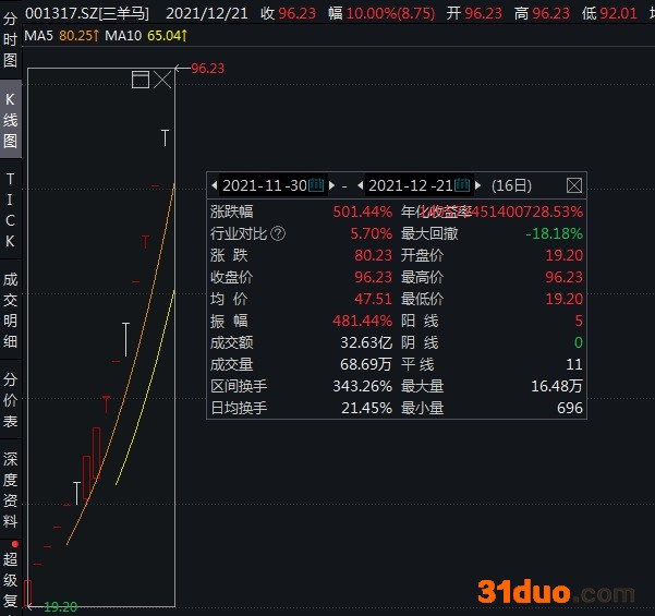 Wind数据显示,三羊马自2021年11月30日上市以来,股票一路“高歌猛进”。按发行价16元/股计算,截至12月21日收盘,三羊马股价连续16个交易日涨停,涨幅累计501.44%,报96.23元。目前,流通市值约19亿元,总市值约77亿元。