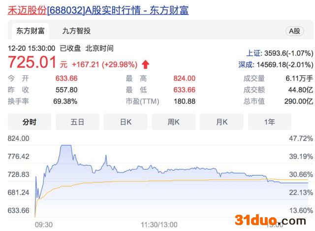 “最贵新股”禾迈股份上市首日推45亿元理财计划,一天涨近30%,中一签浮盈7万多,券商“躺赚”1.42亿元 2021-12-21 21:19 来源:e公司