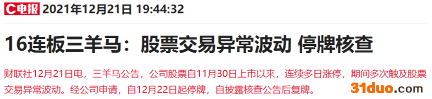 财联社(上海,编辑李梦迪)讯,次新大牛股三羊马晚间公告,连续多日涨停,期间多次触及股票交易异常波动,明起停牌核查。值得注
