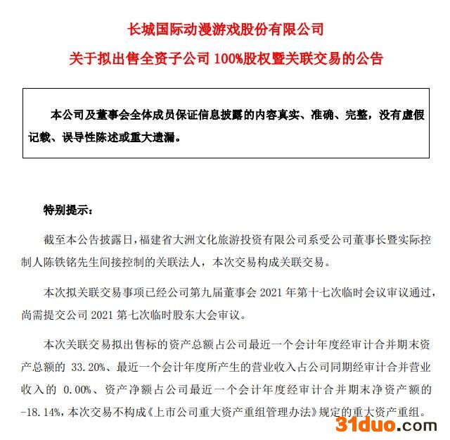 具体来看,21日,*ST长动披露《关于拟出售全资子公司100%股权暨关联交易的公告》,拟以1元价格将全资子公司北京新娱兄弟网络科技有限公司(简称“北京新娱”)100%股权出售给关联方福建省大洲文化旅游投资有限公司。