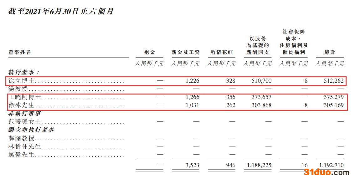 招股书显示,徐立、王晓刚、徐冰三人的薪酬包括薪金及工资、酌情花红、以股份为基础的薪酬开支、社会保障成本、住房福利及雇员福利。其中,截至2021年6月30日止六个月,三人总薪酬中,“薪金及工资”一项分别为122.6万元、122.6万元、103.1万元,“以股份为基础的薪酬开支”一项则分别高达5.1亿元、3.74亿元和3.04亿元。