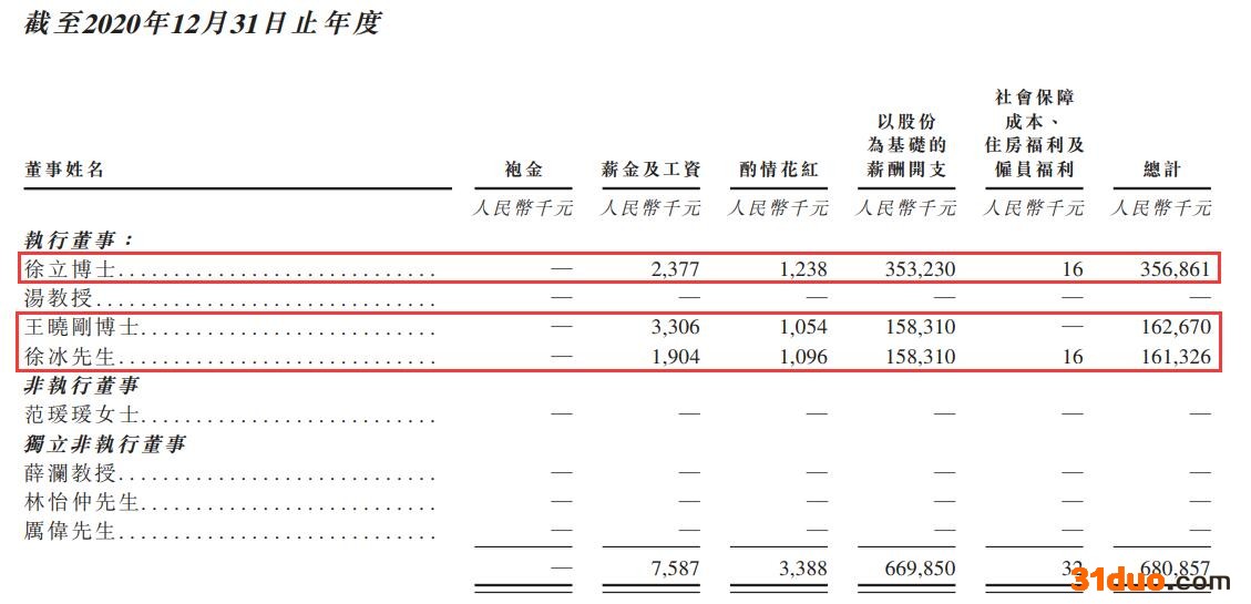 再看2020年,徐立、王晓刚、徐冰三人的总薪酬分别为3.57亿元、1.63亿元、1.61亿元,其中“薪金及工资”一项分别为237.7万元、330.6万元、190.4万元,“以股份为基础的薪酬开支”一项分别为3.53亿元、1.58亿元、1.58亿元。