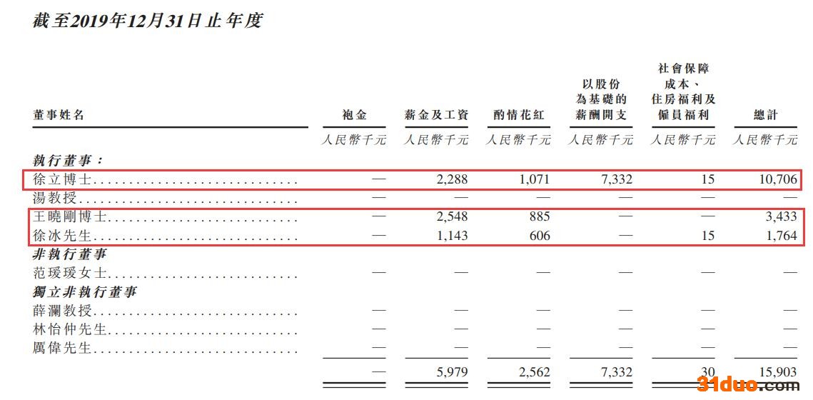 2019年,除了徐立有733.2万元的“以股份为基础的薪酬开支”外,王晓刚和徐冰均没有,所以三人的总薪酬分别为1070.6万元、343.3万元和176.4万元。