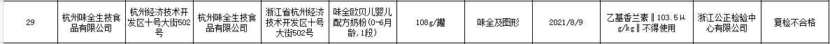 中国网财经12月22日讯(记者 李静)日前,浙江省市场监督管理局发布的食品安全监督抽检信息通告显示,杭州味全生技食品有限公司生产的味全欧贝儿婴儿配方奶粉(0-6月龄,1段,108g/罐,“味全及图形”商标,生产日期:2021/8/9),乙基香兰素检测值为103.5μg/kg,标准规定为不得使用。