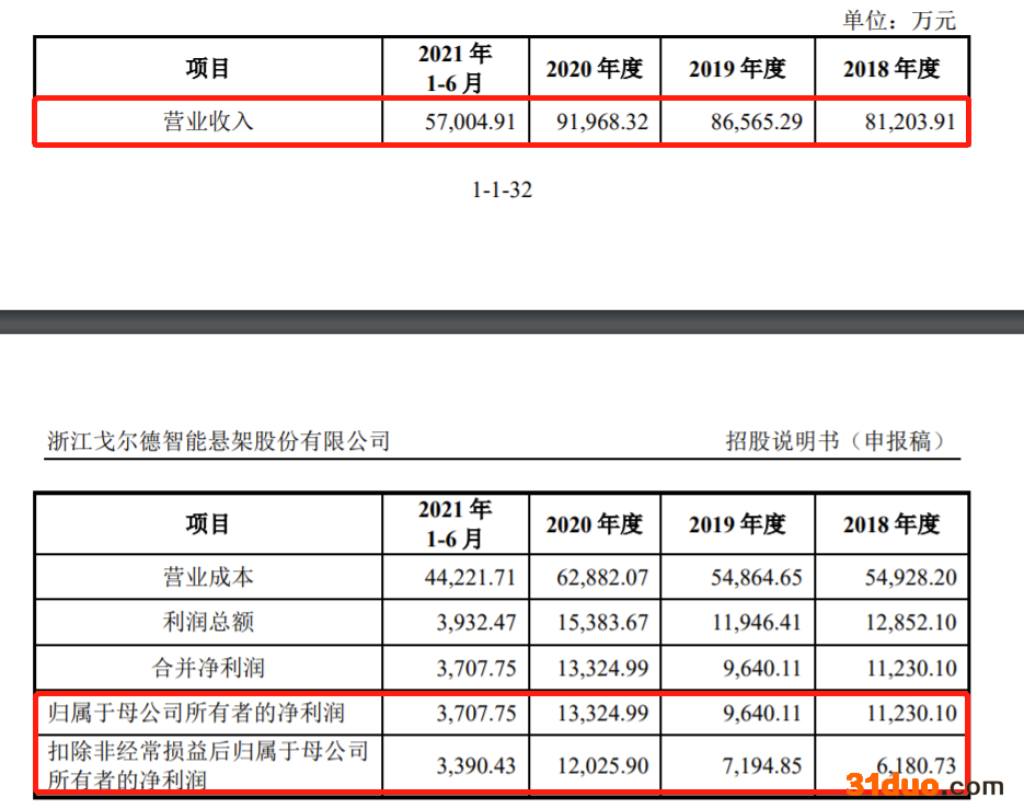 财务数据方面,根据招股书,戈尔德在2018年-2021年1-6月(下称:报告期),实现营收分别为8.12亿元、8.66亿元、9.2亿元、5.7亿元;同期净利润分别为1.12亿元、9,640.11万元、1.33亿元、3,707.75万元。扣非后净利润分别为6,180.73万元、7,194.85万元、1.2亿元、3,390.43万元。