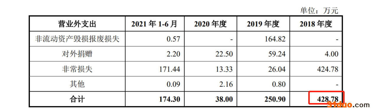 招股书显示,2018年,戈尔德营业外支出金额428.78万元,主要系根据温州市鹿城区人民法院“(2018)浙0302执6847号”结案通知书,浙江亚之星因承担连带担保责任向广发银行温州瑞安支行累计赔付424.39万元。