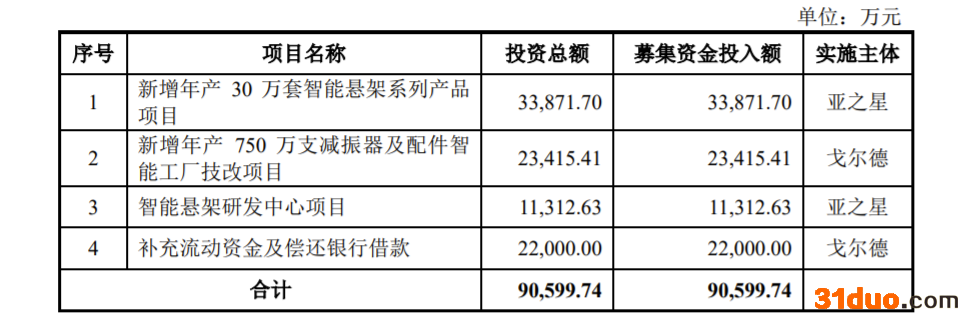 戈尔德本次募集资金用于项目及拟投入的募资金额为:新增年产30万套智能悬架系列产品项目,募集资金投入额约3.39亿元;新增年产750万支减振器及配件智能工厂技改项目,募集资金投入额约2.34亿元;智能悬架研发中心项目,募集资金投入额约1.13亿元;补充流动资金及偿还银行借款,募集资金投入额2.20亿元。