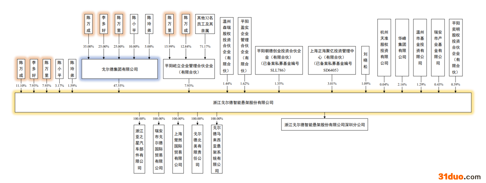 股权结构上,戈尔德集团直接持有47.55%的股权,系控股股东。陈万成、李多好及陈万里3人系实际控制人,合计支配公司82.44%表决权。值得注意的是,戈尔德申报前12个月内新增股东,其中,正海聚亿(私募投资基金)持股3.01%、刘晓松持股1.09%、杭州天准持股0.04%、华峰集团持股2.16%、温州基金持股1.29%、瑞安基金持股0.43%、平阳奕明持股0.39%。