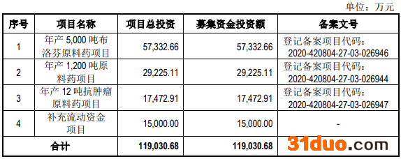 此前披露的招股书显示,亨迪药业原拟募资11.90亿元,拟分别用于“年产5,000吨布洛芬原料药项目”、“年产1,200吨原料药项目”、“年产12吨抗肿瘤原料药项目”、“补充流动资金项目”。