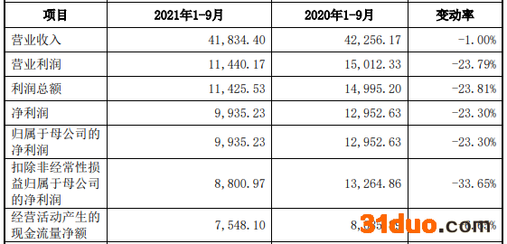 今年前三季度,公司净利润继续下降。2021年1-9月,亨迪药业营业收入为4.18亿元,同比减少1.00%;净利润为9935.23万元,同比下降23.30%;经营活动产生的现金流量净额为7548.10万元,同比下降6.65%。
