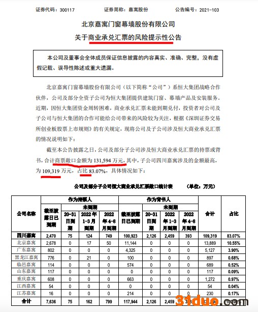 中华网财经12月22日讯:北京嘉寓门窗幕墙股份有限公司(简称“嘉寓股份”,300117.SZ)关于商业承兑汇票的风险提示性公告称,公司系恒大集团战略合作伙伴,公司及部分全资子公司为恒大集团提供建筑门窗、幕墙产品及安装服务。近期,因恒大集团资金周转困难,商业承兑汇票未能到期兑付,投资者对公司及子公司与恒大集团的合作可能给公司带来的风险较为关注,根据《深圳证券交易所创业板股票上市规则》的有关规定,现将公司及子公司涉及恒大商业承兑汇票的情况说明,截至本公告披露之日,公司及部分子公司涉及恒大商业承兑汇票的持票或背书,合计商票敞口金额为131,594万元,其中,子公司四川嘉寓涉及的金额最高,为109,319万元,占比83.07%。