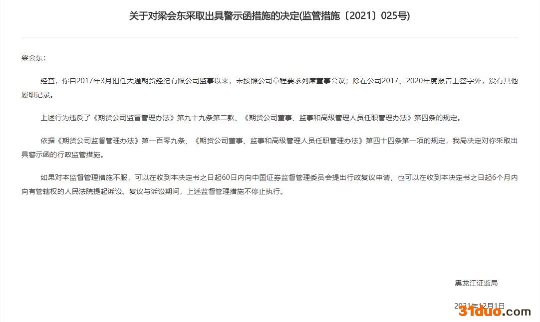 近日,黑龙江证监局公布了一份监管措施决定书,剑指大通期货多项违规。