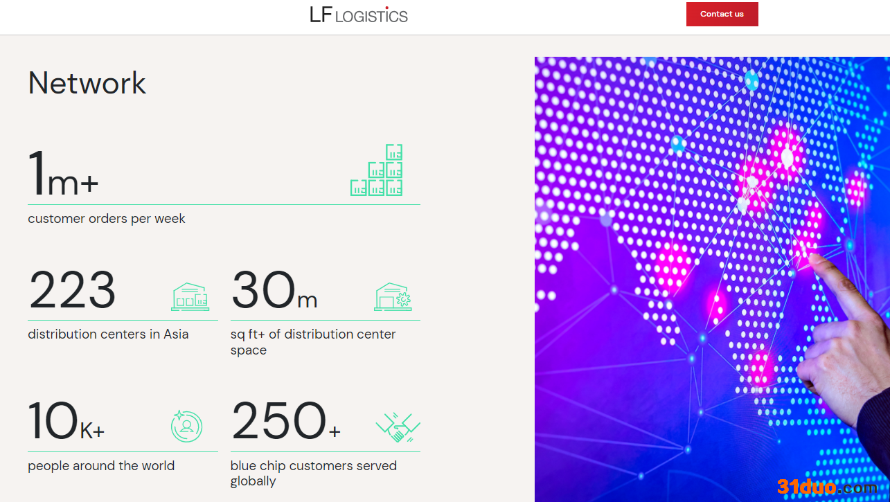 根据利丰物流官网,公司有一个由亚洲223个配送中心和全球250多个客户组成的网络。不仅如此,公司在全球范围内有1万名员工,配送中心总面积达3000万平方英尺,每周能收到超100万份订单。