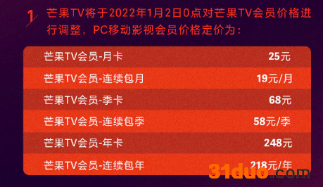中华网财经12月22日讯,据芒果TV会员频道微博消息,芒果TV将于2022年1月2日0点起,对芒果TV PC移动影视会员价格进行调整,同时全面升级会员权益矩阵。在此之前,已经是连续包月/包季/包年尚未取消订阅的芒果TV会员用户,将享有一年保持原价格的服务。