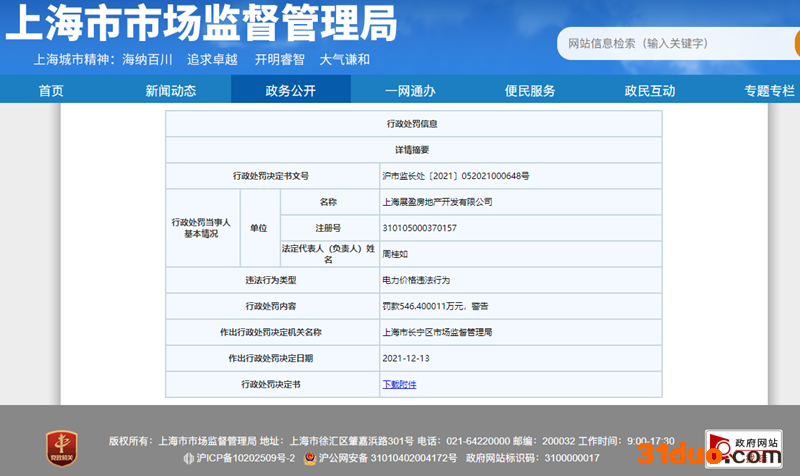 中国网财经12月22日讯(记者 钟文鑫)据上海市市场监督管理局网站消息,近日,建滔地产关联公司上海展盈房地产开发有限公司因加价多收电费行为违反了《中华人民共和国电力法》相关规定,构成电力价格违法行为,被上海市长宁区市场监督管理局责令返还违法收取的费用并罚款546.400011万元。