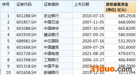 Wind数据显示,IPO融资规模来看,前十名分别为农业银行、中国石油、中国神华、建设银行、中芯国际、中国建筑、中国电信、工商银行、中国平安、邮储银行。融资规模分别为685.29亿、668亿、665.82亿、580.5亿、532.3亿、501.6亿、479.04亿、466.44亿、388.7亿、327.14亿。