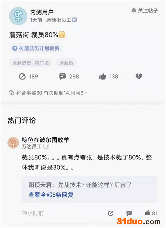 爆料消息称,蘑菇街技术部门调整后只留下三十余人(含前端、后端、客户端、算法等所有技术相关人员),运维部门仅剩3人,产品岗则仅剩2人。据了解,去年4月蘑菇街就曾裁员14%,人数高达140人。