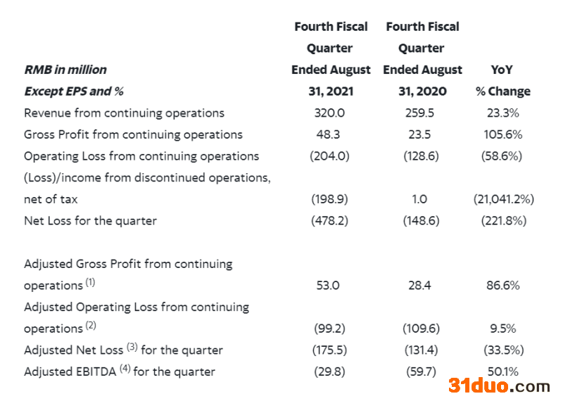 蓝鲸教育12月22日讯,今日,博实乐发布截至8月31日的2021财年第四季度及全年未经审计财务业绩。