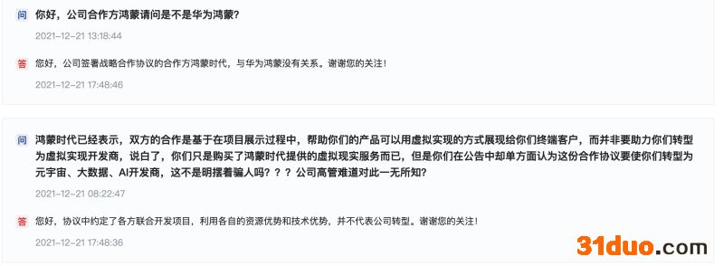 深交所同时表示,12 月 21 日,多篇媒体报道以“华为鸿蒙”、“华为引爆” 等标题对中装建设本次战略合作协议进行解读,需说明本次战略合作方深圳鸿蒙时代虚拟现实技术有限公司与华为是否存在关联。