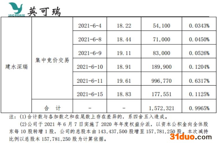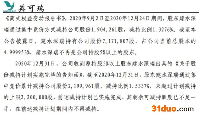 而在2020年12月31日,英可瑞发布公告称,公司收到建水深瑞出具的《关于股份减持计划实施完毕的告知函》,截至2020年12月31日,股东建水深瑞通过集中竞价累计减持公司股份2,199,961股,减持比例1.5337%,未超过计划减持的上限2,200,000股,前述减持计划已实施完成,其剩余可减持额度已不足一手,在前述减持计划期间内不再减持。