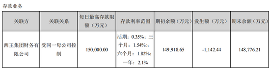 从2018年到2021年上半年,西王食品在西王集团财务有限公司的存款余额分别为11.28亿元、15亿元、14.99亿元、14.88亿元。
