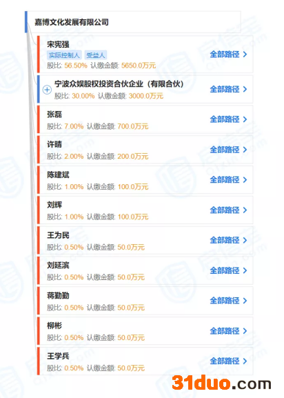 启信宝显示,嘉博文化发展有限公司实控人为宋宪强,持股比例56.5%。