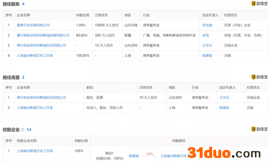 启信宝显示,目前陈建斌在4家公司担任股东,有两家为注销状态,控股14家企业。