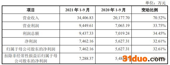 2021年1-9月,雅艺科技实现营业收入3.44亿元,同比增长70.52%;归属于母公司股东的净利润7462.16万元,同比增长32.61%;扣除非经常性损益后归属于母公司股东的净利润7288.37万元,同比增长32.89%;经营活动产生的现金流量净额4918.51万元,同比增长32.36%。