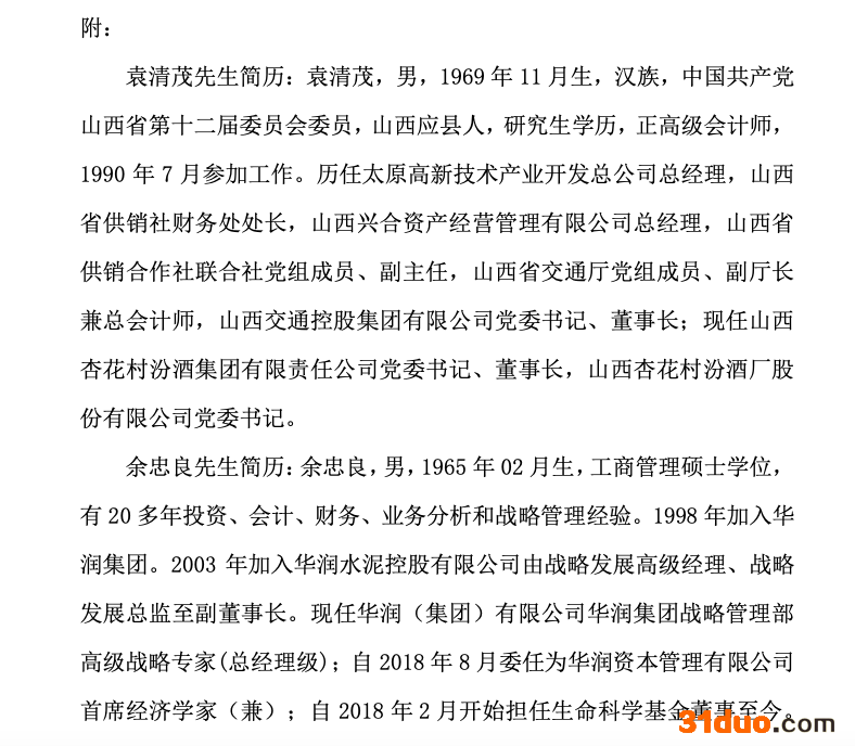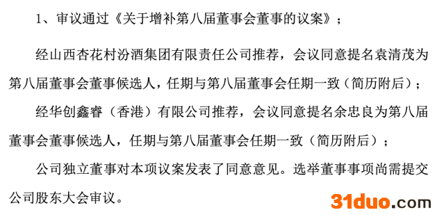 公告称,经山西杏花村汾酒集团有限责任公司推荐,会议同意提名袁清茂为第八届董事会董事候选人,任期与第八届董事会任期一致。经华创鑫睿(香港)有限公司推荐,会议同意提名余忠良为第八届董事会董事候选人,任期与第八届董事会任期一致。选举董事事项尚需提交公司股东大会审议。